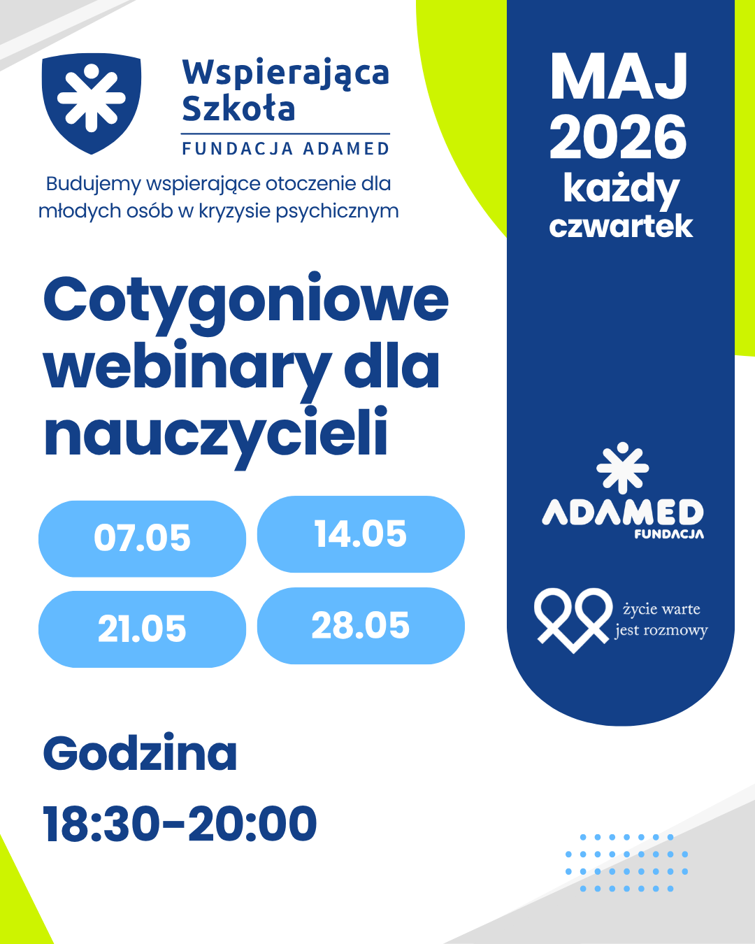 Fundacja Adamed oraz Fundacja Życie Warte Jest Rozmowy w ramach programu Wspierająca Szkoła serdecznie zapraszają na bezpłatne cotygodniowe webinary dla nauczycieli pt. „Pierwsza pomoc nauczycielska”.
